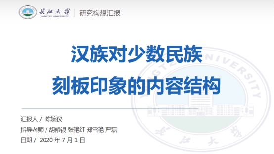 (通讯员 陈语萱)2010年7月1日,第65期社会心理学例会采取线上的方式如期举行。郑雪艳老师、严磊老师、张艳红老师以及三峡大学教育学院杨林川老师团队参加了本次例会。本次例会由朱小梦同学主持,陈婉仪同学进行研究构想汇报:“汉族对少数民族刻板印象的内容结构”。