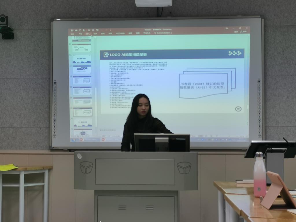 罗学敏汇报完毕后,同学们针对她的汇报提出了几个问题:1、为什么在理论中提及注意回复理论?2、欲望指数量表测量的是什么?3、为什么调节作用只出现在上半段?针对这三个问题,罗学敏做出了相应的回答。有一些她暂时没办法回答的问题将在私下查阅相关文献后再进行讨论。随后,严磊老师对罗学敏的汇报提出了一些自己的想法,严老师问到,这个研究的出发点是否是要提升大学生的幸福感?如果是,在现有研究中怎样能让人变得更幸福呢?如果有这些方法,我们怎样维持住自己的幸福感?严老师提出这三个问题的目的是在于让罗学敏同学思考清楚她的研究问题到底是什么?该从哪里入手。紧接着严老师又提出自然联结是要解释怎样的心理现象,进一步帮助学敏进行思考。最后,又从自然联结的分类切入为罗学敏同学提供了几个想法和思路,罗学敏十分感谢严老师的建议,并表示一定会再深入研究。