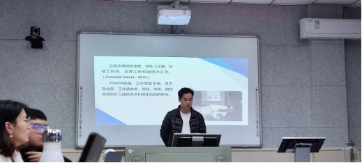 在讨论交流环节,同学们就灵活工作安排在国内研究的难度、领导原型量表条目等展开了火热的讨论。接下来是老师点评环节。张老师首先肯定了该研究的意义和价值,但也指出了在国内开展“灵活工作安排”研究和确定该研究对象的难度,建议陶雪飞加强本研究的理论基础,在互联网和IT行业展开研究,并且可以挖掘不同领导原型和类型的作用,不单单是领导原型水平的高低,还可以关注领导者的人口学变量,如年龄、任期时长和学历等因素的影响。另外对于员工来说,本职工作是最重要的,所以还需考察员工角色内绩效;最后使用国外的测量工具要结合本土实情进行修订,凝练相关问卷条目,检查问卷的信效度。张老师的建议对到会的每一个同学来说,都是一盏明灯,照亮了大家学术研究的前进之路。