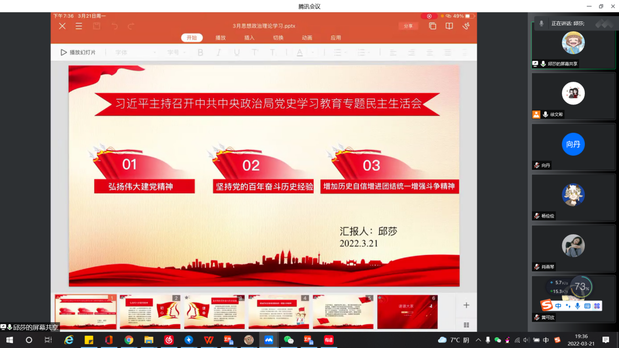 按照学习安排,各班通过集体观看新闻视频、诵读理论知识读本、学生讲解精神讲话等多种形式开展了政治理论学习活动。21级教育类研究生在线上学习习近平总书记给冰雪健儿的回信精神、学习习近平在中央党校(国家行政学院)中青年干部培训班开班式上发表的重要讲话精神以及习近平总书记关于不断巩固拓展党史学习教育成果的重要指示;21级体育类研究生组织大家学习习近平总书记给冰雪健儿的回信、观看有关冰雪健儿刻苦训练的纪录片,看着冰雪场上冰雪健儿激扬自我,勇于超越的比赛镜头,大家倍感振奋,同时对习近平总书记的回信的有了更深刻的感悟,对国家举办冬奥会艰难的准备历程有了更全面的了解;20级教育类研究生则由学生代表解读习近平总书记的重要精神及讲话、带领大家了解中共中央政治局党史学习教育专题的思想与精神,同学们纷纷畅谈学习的心得体会。20级体育类研究生观看两会视频,并由学生做学习汇报。