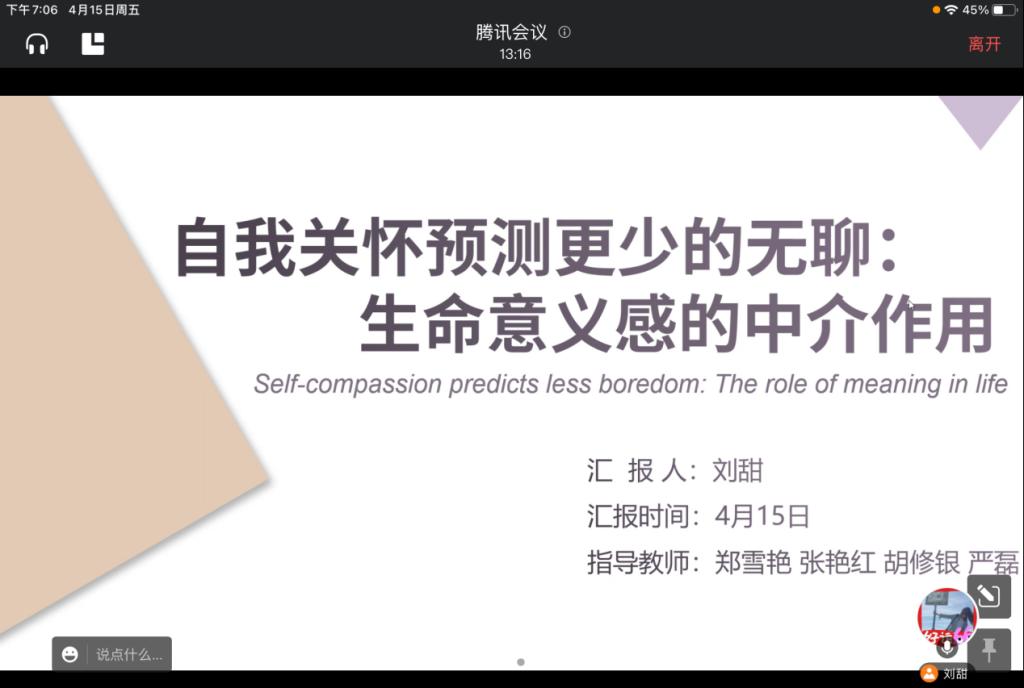 (通讯员:吴新丽2022年415日晚19点至21点,第107期社会心理学学术例会在线上举行。参加例会的有郑雪艳老师和张艳红老师,以及10名心理学研究生和一名22级准心理学研究生参加。本次例会由研二胡汇鑫同学主持,研一刘甜同学进行文献汇报,汇报文献为《Self-compassion predicts less boredom: The role of meaning in life》。