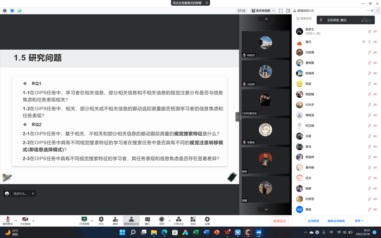 会议正式开始,首先由黄贝同学进行文献汇报,题目为《网络信息问题解决过程中的视觉搜索模式、信息选择策略和信息焦虑》,该文章发表在《Computers & Education》。黄贝同学的汇报从五个方面展开,首先是研究背景,包括前言、方法、结果、讨论、结论及思考。重点解释了作者如何运用回归分析,聚类分析,滞后序列分析的方式对高中生在执行OIPS任务时在线信息搜索的快速扫描和深度处理视觉行为进行分析,以探究在OIPS任务中,学习者在相关信息、部分相关信息和不相关信息的视觉注意分布是否与信息焦虑和任务表现相关?
