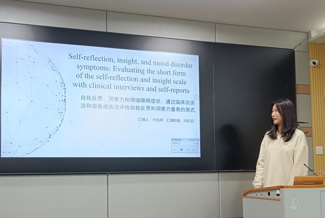 例会正式开始,首先由付兆宇同学进行了文献汇报,题目为《self-refection ,insight ,and mood disorder symptoms: Evaluating the short form of thes elf-reflection and insight scale with clinical interviews and self-reports”》。汇报内容分为问题提出、研究一、研究二以及总讨论四个部分。该研究目的是:计算简版量表和长版量表的相关程度,以此验证简版量表的有效性;并关注心理健康和自我反思与洞察力之间的关系。并分为了两个子研究,研究1:一组年轻人完成SRIS和自我报告的抑郁和焦虑症状指标;研究2:一组参加过抑郁症结构化临床访谈的被试完成了问卷。该研究结果发现,几乎所有相关结果简版量表和原版量表都有着高度相似性,也就是说简版量表可以被应用。