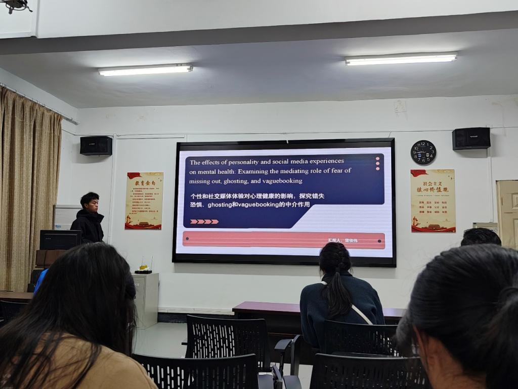 首先,蒲俊伟同学给我们分享2023年发布在《Computers in Human Behavior》杂志上的一篇文献,文章的题目是《The effects of personality and social media experiences on mental health: Examining the mediating role of fear of missing out, ghosting, and vaguebooking》,蒲俊伟同学从四个方面进行汇报,首先从介绍社交媒体的兴起到社交媒体的使用与心理健康之间的关系,然后也对中介变量概念进行讲解,通过结构方程模型逐步展开研究。随后秦珂楠同学、吴欣格同学提出了自己的疑问,连帅磊老师、朱晓伟老师也同样对蒲俊伟同学进行提问。最后,各位老师对文章进行讨论,朱晓伟老师和朱婷老师对组内同学提出要求,在阅读模型建构这类的文章时一定要阅读里面提及的参考文献才能梳理清楚文章脉络。