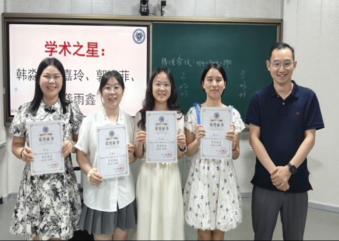 接着,获得2023-2024学年长大社心年度“学术之星”荣誉称号的学生是:心健QZ221班韩淼、教育学QX231班刘嘉玲、教育12102班龚雨鑫、教育12103班郭姿菲,由严磊老师为以上获奖者进行颁奖。