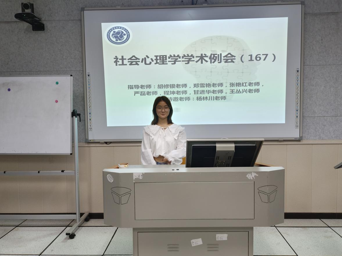 (通讯员:王洋)2024年10月11日19时至21时,第167期社会心理学学术例会在11教201室如期举行。本次例会采取线上线下相结合的形式,由姚露馨同学主持,主题为“毕业论文进展”。参加本次例会的老师有郑雪艳老师、严磊老师、程坤老师、甘进华老师、王丛兴老师以及杨林川老师(三峡大学),学生有17位心理学研究生,31位本科生科研助理。