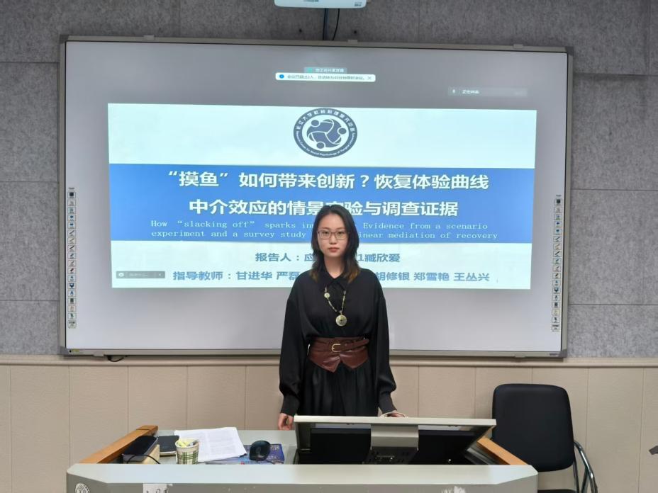 最后,由臧欣爱同学汇报的《“摸鱼”如何带来创新?恢复体验曲线中介效应的情景实验与调查证据》同样引人关注。在当今快节奏的工作环境下,员工常面临工作与生活边界模糊等压力,“摸鱼”(时间窃取)行为日益复杂且频发,该研究基于资源保存理论,通过2个实验发现,时间窃取与恢复体验呈倒U型关系,进而间接地促进或抑制了创新行为, 这一关系受到正念的调节。这一发现丰富了相关研究理论并提供了实践启示。