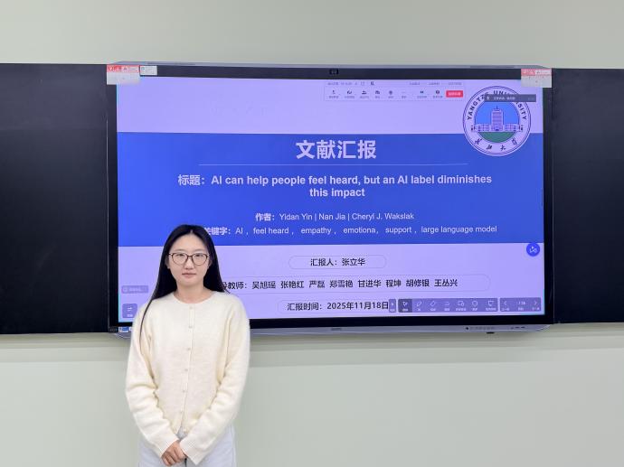 其次,张立华同学进行了文献汇报,其汇报题目为《AI能让人获得被倾听感,但AI标签会削弱该效果》。