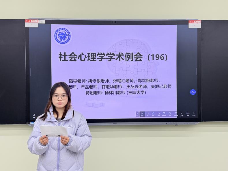 (通讯员:唐可心)2025年11月18日19:00至21:00,第196期社会心理学学术例会在bat365官方网站东校区16教A104室如期举行。本次例会采取线上线下相结合的形式,由本科生科研助理袁芯丽同学主持,主题为“文献分享汇报”。参加本次例会的老师有甘进华老师、吴旭瑶老师和杨林川老师(三峡大学),学生有9位心理学研究生,16位本科生科研助理。
