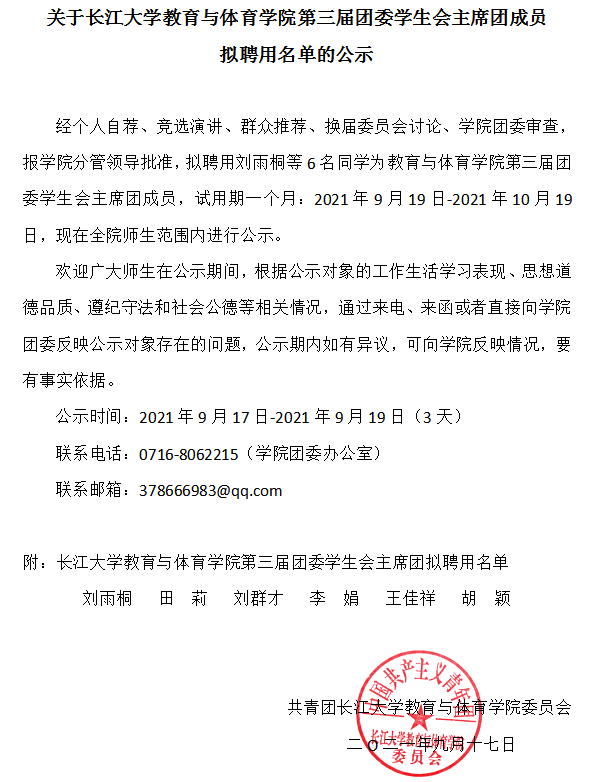 关于bat365官方网站第三届团委学生会主席团成员拟聘用名单的公示