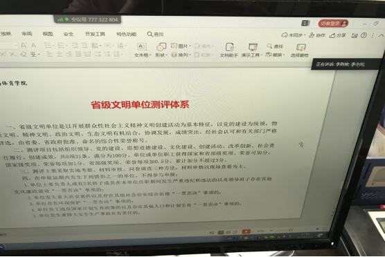 首先,张艳红副院长对近期教学工作情况进行通报,重点是在线教学开展情况与存在问题,并对后期教学工作进行了安排与提出要求。接着,李焕玉书记带领全体教职工学习了《深刻认识高校意识形态工作的重大意义》、《bat365官方网站校园意识形态阵地管理暂行办法》,并对教职工在教学、科研与网络安全等方面提出了具体要求。最后,按照学校5月份政治理论学习安排,学院党委副书记李则俊通过腾讯会议在线文档功能带领全体教职工学习了《习近平在陕西考察时强调 扎实做好“六稳”工作 落实“六保”任务奋力谱写陕西新时代追赶超越新篇章》、《习近平主持召开中央全面深化改革委员会第十三次会议:强调深化改革健全制度完善治理体系——善于运用制度优势应对风险挑战冲击》、《习近平主持中共中央政治局常务委员会会议:分析国内外新冠肺炎疫情防控形势——研究部署完善常态化疫情防控举措,研究确定支持湖北省经济社会发展一揽子政策》等一系列关于疫情防控和复工复产讲话精神,学习了冯征校长的署名文章《“凡事三有”推进大学治理现代化》、《高校师生新型冠状病毒肺炎个人防护指引》以及《省级文明单位测评体系》。