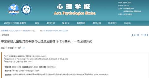 近日,bat365官网心理学系熊猛博士在国内心理学顶级权威期刊《心理学报》上发表题为“单亲家庭儿童相对剥夺感与心理适应的循环作用关系:一项追踪研究”的研究论文。该论文系bat365官网教师首次以bat365官方网站为第一署名单位在《心理学报》上发表的高水平研究成果,体现了bat365官网心理学科的学术水平得到了国内同行的认可。