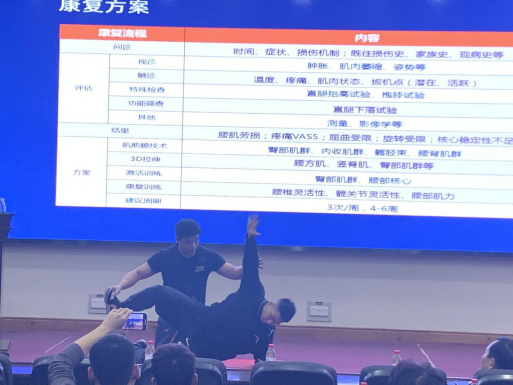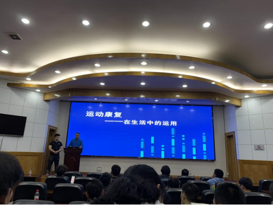 会议伊始,陈泳龙总监首先针对什么是运动康复进行了介绍。随后又围绕当前康复核心技能、运动康复流程、常见康复干预手段以及腰痛干预手段等六个方面进行了详细讲解。整场报告与社会实际相结合,理论解读和案例展示相配合,通过“手枪试验”、颈部放松以及托马斯测试等现场互动,切实讲解了运动康复在实际生活中的运用问题,为体育专业学生开辟了新的思路。