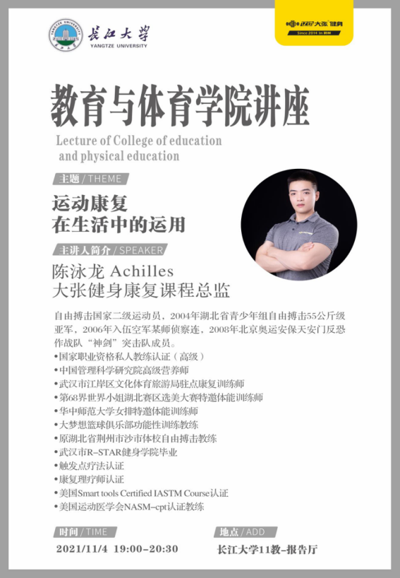 (通讯员 吴 敏) 11月4日19点,bat365官方网站在11教学术报告厅举办运动康复专题报告会。荆州市大张健身康复课程总监陈泳龙先生受邀作《运动康复——在生活中的运用》的专题讲座。会议由社会体育指导与管理系主任孔祥魁副教授主持,院长张相乐教授、张云洁老师及bat365官网体育专业部分本科生及研究生参加了本次讲座。