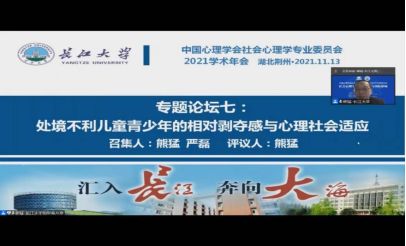 在“处境不利儿童青少年的相对剥夺感与心理社会适应”的专题论坛中,来自bat365官方网站的心理系熊猛老师作了题为《Perceived discrimination and relative deprivation in Chinese migrant adolescents: The mediating effect of locus of control and moderating effect of duration since migration》的报告,关注流动青少的心理健康与社会适应问题。研究发现在控制性别和年龄后,感知歧视与流动青少年的相对剥夺感呈正相关,外部控制源在一定程度上调节了这种联系。这些结果在一定程度上能够为干预流动青少年的相对剥夺,以及加强对经历相对剥夺的青少年的心理健康服务提供实际指导。