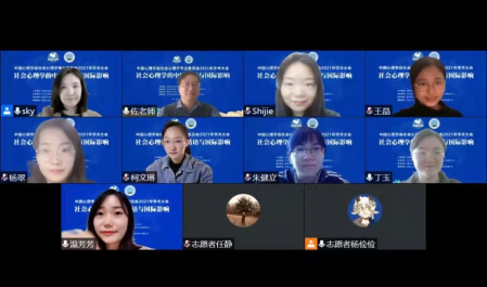 2021年11月13日下午2点,中国心理学会社会心理学专业委员会2021年学术大会分组报告拉开帷幕。本次学术大会设有7个专题论坛,分别为“社会转型与经济社会心理”、“社会群体印象评价”、“面孔吸引力的曝光效应与适应后效”、“网络中的亲社会行为”、“传统文化心理”、“手机依赖及其干预研究”以及“处境不利儿童青少年的相对剥夺感与心理社会适应”。还设有31个口头报告分组和7个展贴报告组,其中包括“社会认知”、“社会心理服务”、“人际与群际关系”、“文化心理”、“自我心理”、“心理健康”、“决策与消费”和“组织心理”九大主题。