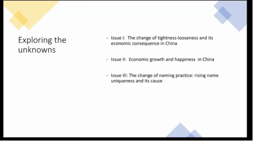 讲座的主题包含三个研究问题,分别是:1.社会松紧变迁及其在中国的经济影响;2.经济增长与主观幸福感之间的关系;3中国人起名字的变化:名字独特性趋势的上升及其原因。