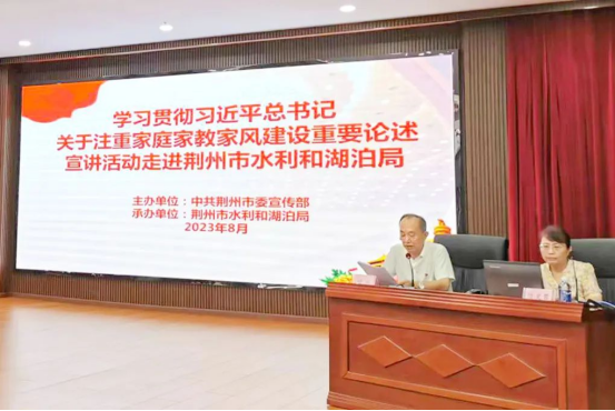 8月11日,bat365官网陈竞蓉教授作为荆州市“荆津乐道”党的创新理论社科专家成员赴市水利和湖泊局开展“荆津乐道”公益宣讲。陈竞蓉教授以《培育优良家风 涵养时代正气》为题,从“为什么:不忘初心、方得始终;是什么:思想引领、守正创新;怎么做:严于律己、严格家教”三个方面阐述了家庭家教家风建设的重要意义和现实要求,主题鲜明,内容丰富,说理透彻,引人深思。