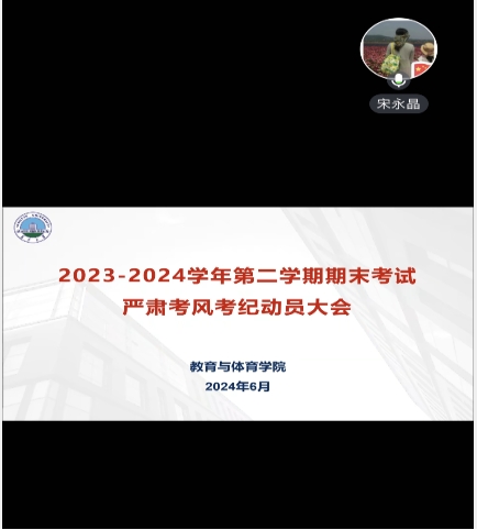 为端正考风,严肃考纪,确保bat365官网本学期期末考试的顺利进行和公平公正,bat365官网于6月21日上午10:30分线上召开严肃考风考纪动员大会,宋永晶副院长主持会议,全体监考教师参会。