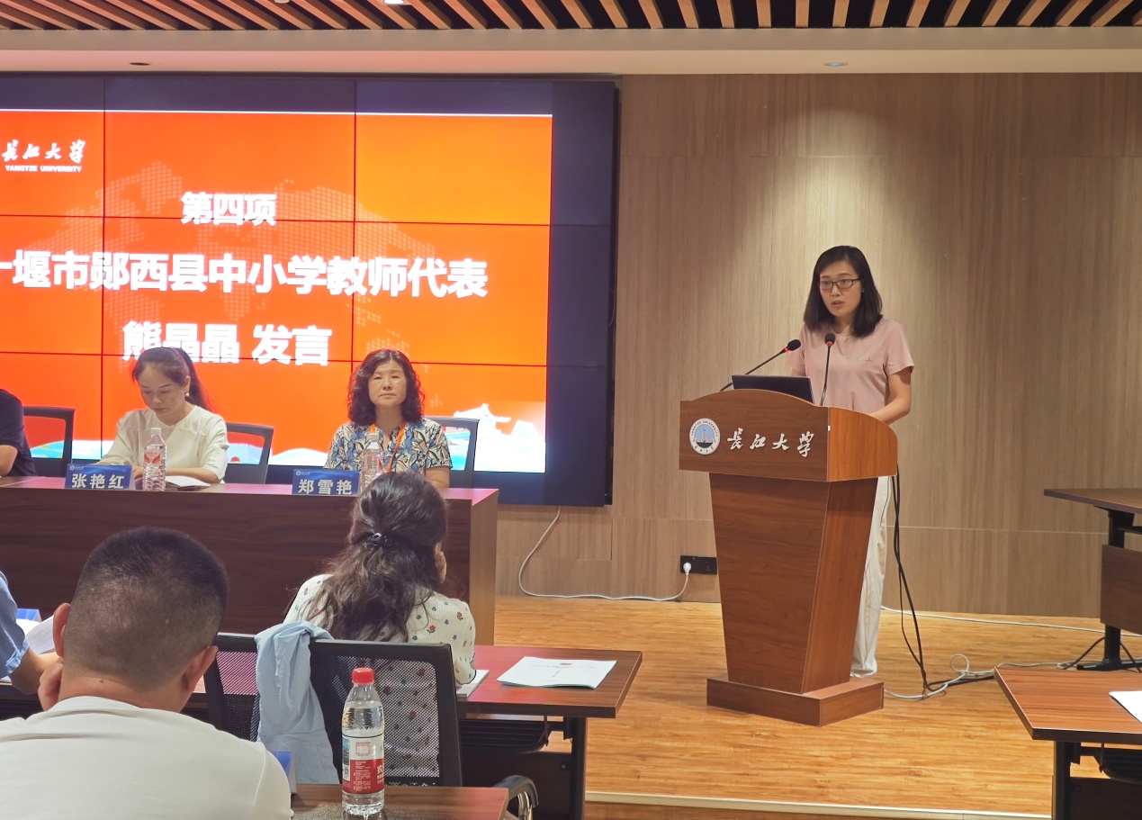马安镇中心小学熊晶晶作为教师代表登台发言,她以一线教师的视角,分享对教育帮扶的理解,表达了珍惜培训机会、渴望与同仁交流共进、将所学转化为教学动能的决心,质朴话语传递出教育人向上的力量。