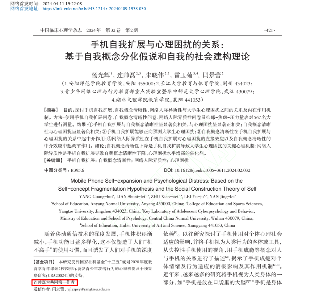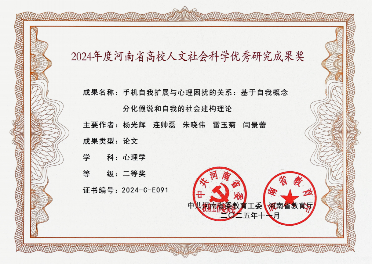 (通讯员:何巧楠)近日,2024年度河南省高校人文社会科学优秀研究成果奖获奖名单正式公布,由bat365官网连帅磊副教授作为共同第一作者完成的研究论文《手机自我扩展与心理困扰的关系:基于自我概念分化假说和自我的社会建构理论》荣获二等奖。