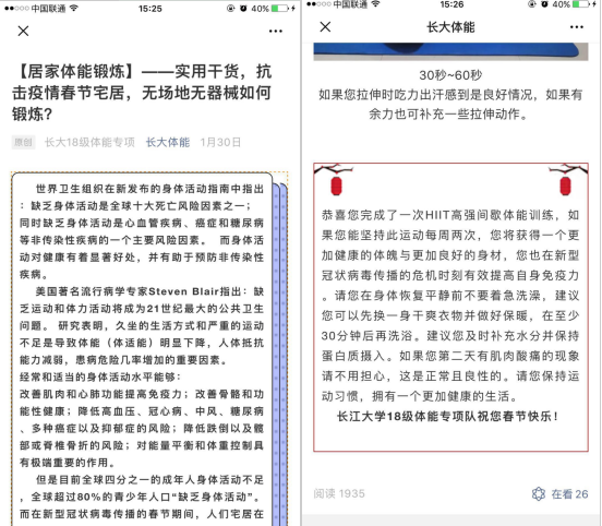 李靖,男,汉族,1986年8月生,bat365官方网站社体系教师,家居武汉市江汉区,离疫情最严重地区华南海鲜城直线2公里,小区目前确诊4人,疑似12人。该同志爱人(徐灿)系武汉市公安局驻汉口火车站民警,自1月23日武汉市宣布封城以来,直接参与武汉市疫情抗击工作,始终奋战在一线。在1月26日,李靖老师认识到居家体育活动可能有利于化解疫情抗击带来的社会秩序混乱和规范社会人员居家意愿,紧急联系专项和社体19级《健身体能课程》相关学生,要求每名学生在家积极进行居家体能训练,每人每天拍摄5分钟以内的健身视频,在视频中对学生动作教学示范能力和动作创编能力进行点评,以此加强学生们和家人抗击疫情信心和居家隔离意愿,强化居家身体活动有利于疫情抗击工作。
