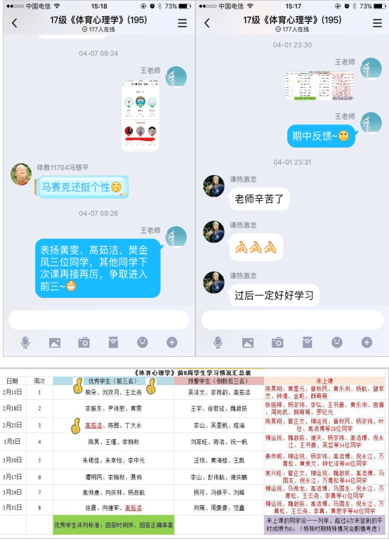 教学实施阶段,樊翠红同志从新型肺炎防控宣传和学生的心理疏导入手,先做好卫生和健康教育,疏导学生的恐慌和紧张情绪;注重学生学习能力培养,提倡学会学习与学习知识同等重要的教学指导思想;课前,利用幕课资源、发放教学预习资料、预设启发式问题进行课前预习;课中,重组教学内容,采用知识点归纳、每课测评、讨论等形式打造30分钟小节课堂,较好地完成了重难点精讲和在线辅导答疑;课后,让学生整理笔记,录制训练视频,自主练习居家防疫操等形式, 增加学习信心,激发学生顽强拼搏的精神斗志,提振士气。