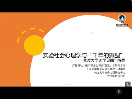 严磊博士讲座的主题是“实验社会心理学与‘千年狐狸’——普渡大学访学见闻与感悟”。他首先介绍了在普渡大学访学期间的见闻,包括普渡大学心理学系的建设情况、课程设置和教学组织形式以及课程特点。