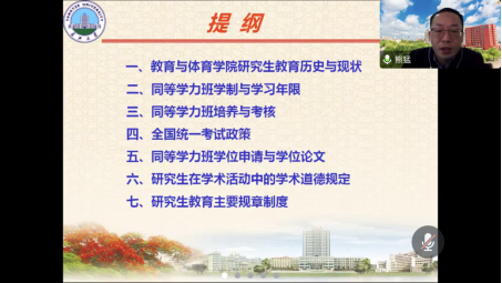 2022年12月23日上午,bat365官网在线上举行2022年同等学力硕士班开班典礼,研究生院曾威副院长、bat365官方网站李则俊副书记、杜光友副院长、熊猛副院长等院领导、研究生导师代表、研究生教学秘书和全体同等学力申硕新生参加了典礼,活动由李则俊副书记主持。