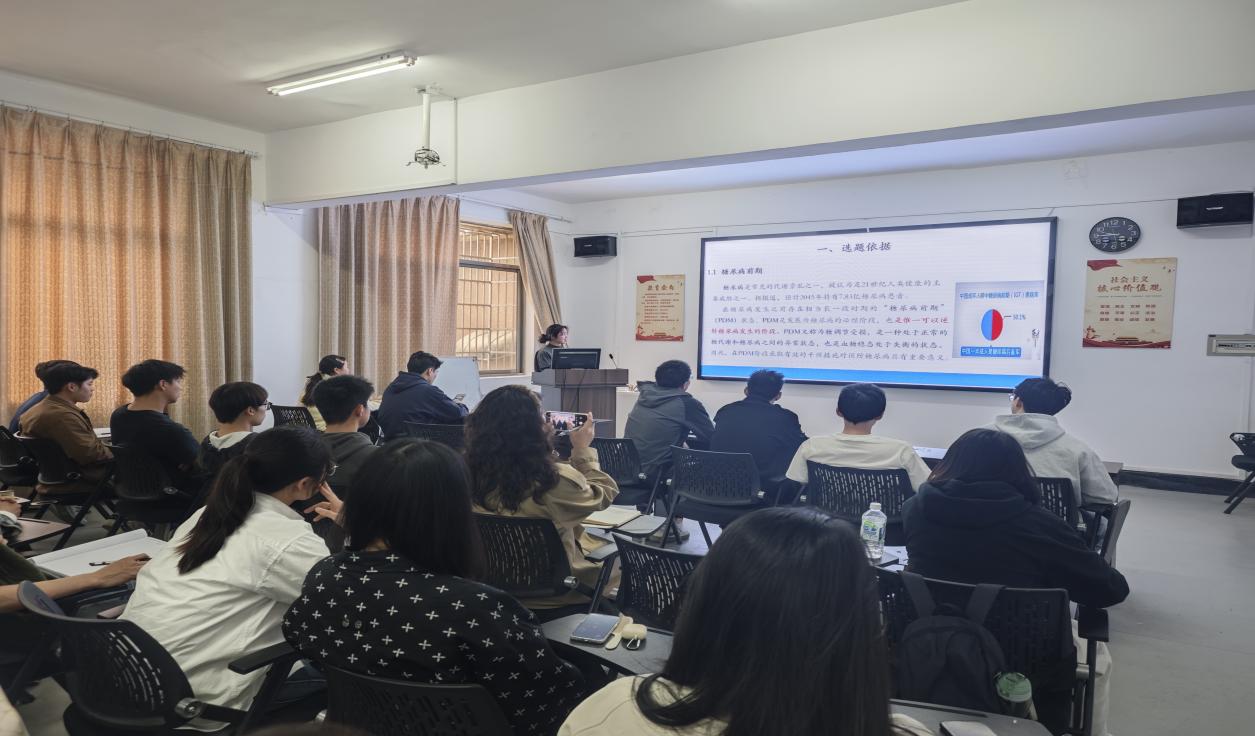 胡淑娟博士从主题选题依据、研究目的与意义、创新之处、研究思路与结果、结论、问题与展望六个方面展开。她首先向学生们介绍了糖尿病前期、运动与糖尿病、NLRP3炎症(小)体与糖尿病、运动、NLRP3炎症体及T2DM的关系,揭示了该研究的背景与可能性。同时以NLRP3炎症小体的视角探究有氧运动对糖尿病前期患者(慢性病患者)等的独特价值与采用有氧运动与现代分子医学交叉的方法,通过临床干预实验、动物实验和细胞实验的结合,首次尝试建立小鼠PDM模型对NLRP3炎症小体在有氧运动维持葡萄糖稳态的作用机制进行研究。