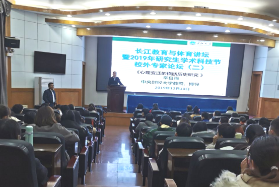 (通讯员 陈语萱、代晋/文/摄)12月10日 晚上七点,教育与体育学院在东校区11教报告厅举行了长江教育与体育讲坛((2019年第二讲))暨bat365官方网站2019年研究生学术科技节校外专家论坛。本次论坛以“心理变迁的横断历史研究”为主题,中央财经大学社会与心理学院院长辛自强教授担任此次活动的主讲人。报告会由教育与体育学院副院长熊猛博士主持,李焕玉书记、张艳红副院长、潘友刚老师、郑雪艳老师、朱晓伟老师、冯雪老师、卢忠耀老师和闫景蕾等老师莅临现场,大二、大三心理学专业同学以及全体研究生参加了此次学术报告会。