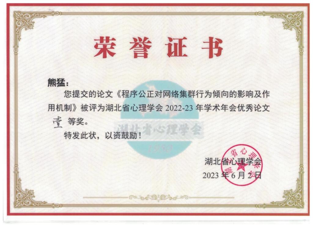 在大会报告环节,张艳红教授受邀在主会场作了“孤独感与手机成瘾”的大会重点报告并主持了社会与人格心理论坛分会场报告;熊猛教授受邀主持了网络心理与行为论坛分会场并作了“程序公正对网络集群行为倾向的影响及作用机制”的主题报告;朱晓伟副教授受邀参与了心理学人才培养论坛分会场研讨交流。心理学研究生程丽媛、魏文欣、任杰和体育学研究生杨玉娟分别围绕“网络小说成瘾与抑郁”、“权力感与大学生亲社会行为”、“童年压力与锻炼承诺”、“拖延行为的现状、热点与前沿”等主题在分会场作了学术报告。闭幕式上还举行了学术年会优秀论文颁奖仪式,熊猛教授提交的研究成果《程序公正对网络集群行为倾向的影响及作用机制》荣获优秀论文一等奖。