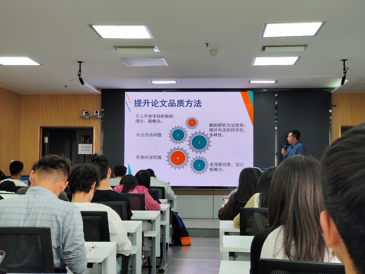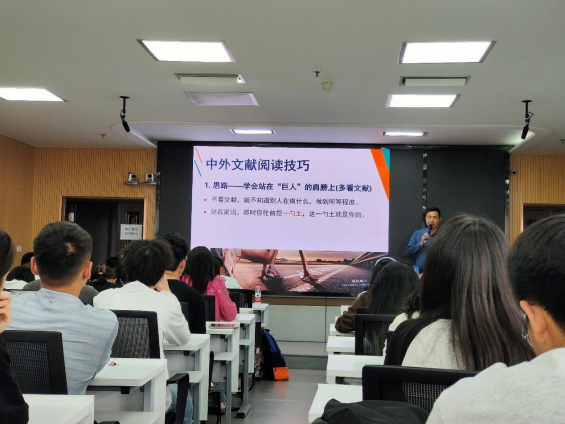 学术是一个生活之道,是一种人持续思考的工作和生活,在学术领域中,成功不只是靠天赋和运气,而是需要一系列扎实的技能和持续的努力。张春合教授首先为大家介绍了中外文献的阅读技巧,他指出,找好思路在论文阅读与写作中具有重要作用,同时研究生在阅读文献时要关注最前沿,并用在路的尽头挖一点土类比同学们在学术前沿进行创新。其次,张春合教授从选择优秀文献、文献处理的工具这两方面进一步进行介绍。最后从仰视、平视、俯视三个角度及十个具体步骤向同学们介绍应当如何阅读文献。