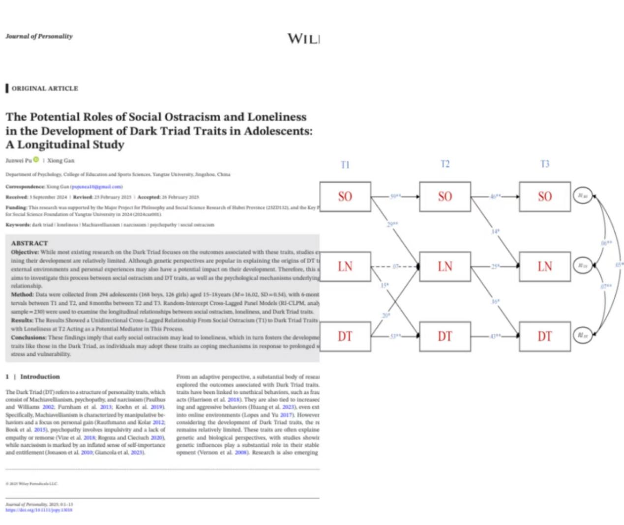 (通讯员 张绍杰)近日,bat365官网硕士生蒲俊伟在APA主办的国际顶刊《Journal of Personality》(中国科学院SSCI/SCI分区心理学大类一区Top期刊,5年IF = 5.4)上发表题为“The Potential Roles of Social Ostracism and Loneliness in the Development of Dark Triad in Adolescents: ALongitudinal Study”的文章。蒲俊伟为论文第一作者,甘雄副教授为通讯作者。该研究是湖北省高等学校哲学社会科学研究重大项目(23ZD132)和bat365官方网站2024年社会科学基金重点项目(2024csz001)资助的系列成果之一。