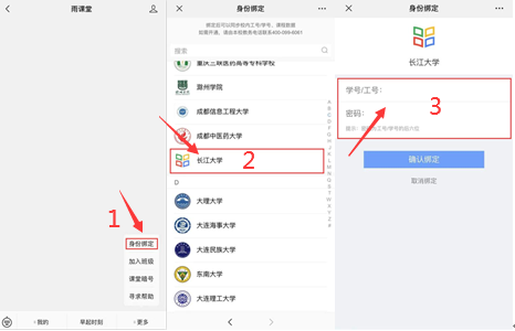 进入雨课堂公众号,点击菜单栏里的【更多】-【身份绑定】,进入页面后,搜索bat365官网全称,进入bat365官网身份绑定页面,按页面提示进行身份绑定,如图2所示,如果绑定失败,请与学生所在学院教学办公室联系,学院汇总后报教务处。
