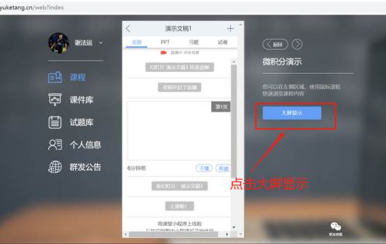 进入课程观看页面后,按照图8的箭头指示点击进入当前直播页面,选择【进入大屏显示】,如图9所示,即可进入大屏直播页面。