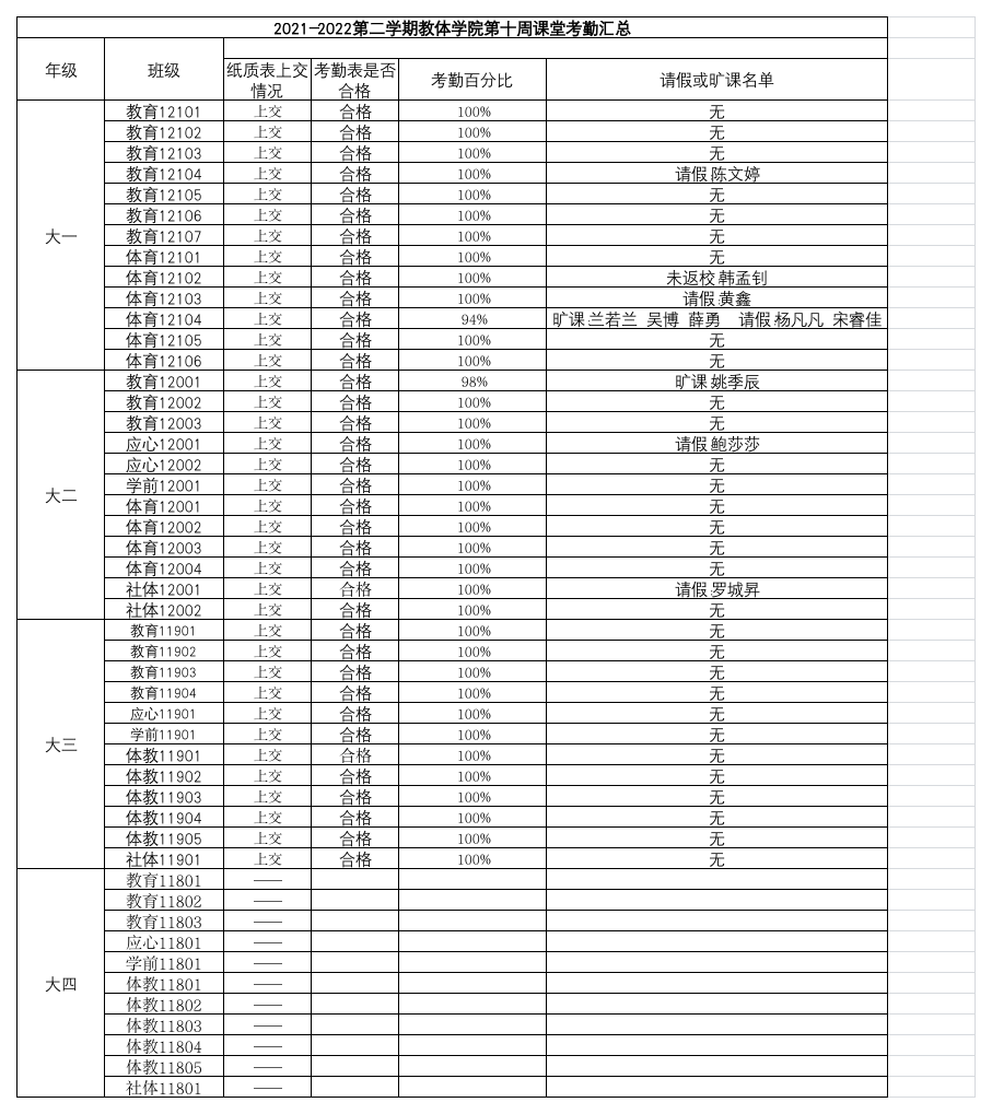 2021-2022年第二学期教体学院第十周课堂考勤汇总