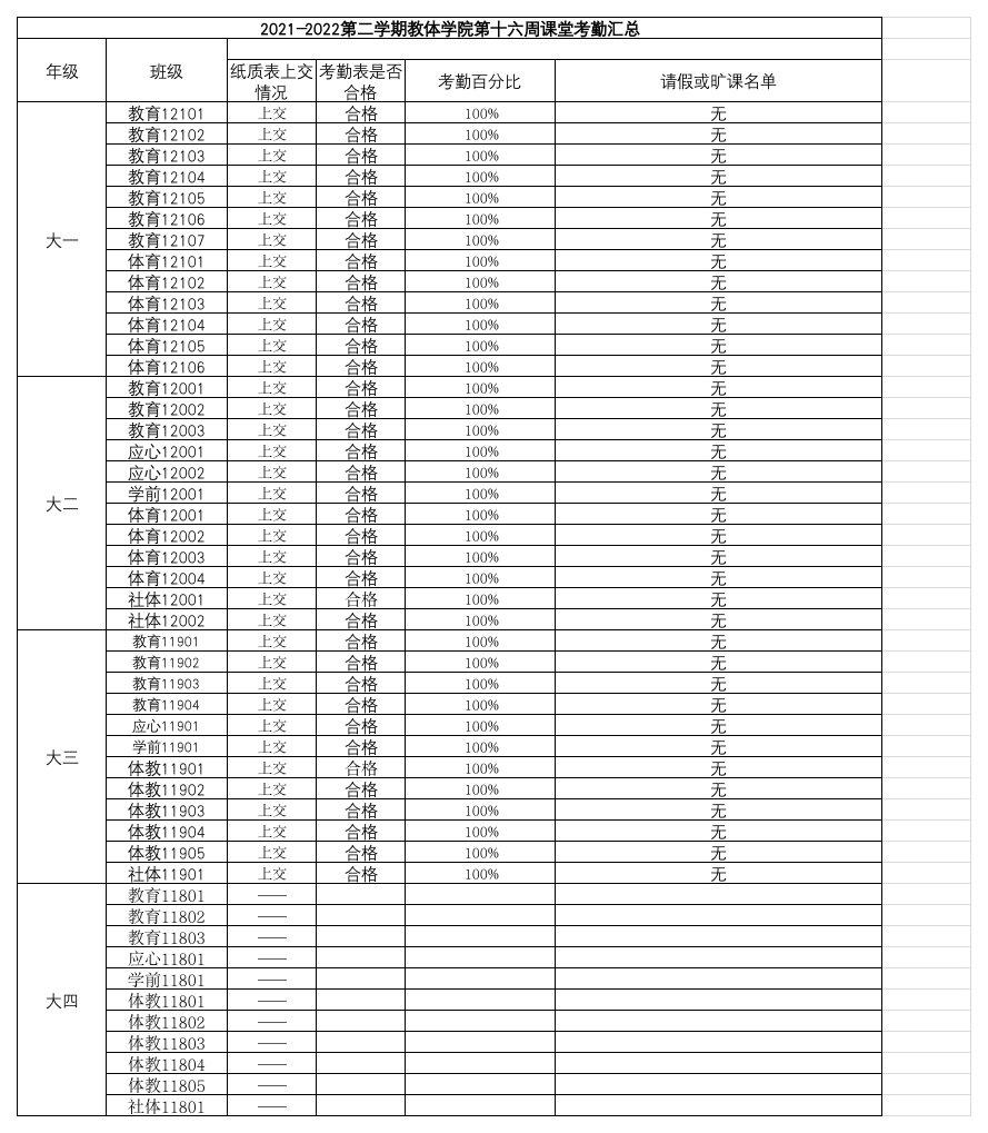 2021-2022年第二学期教体学院第十六周课堂考勤汇总