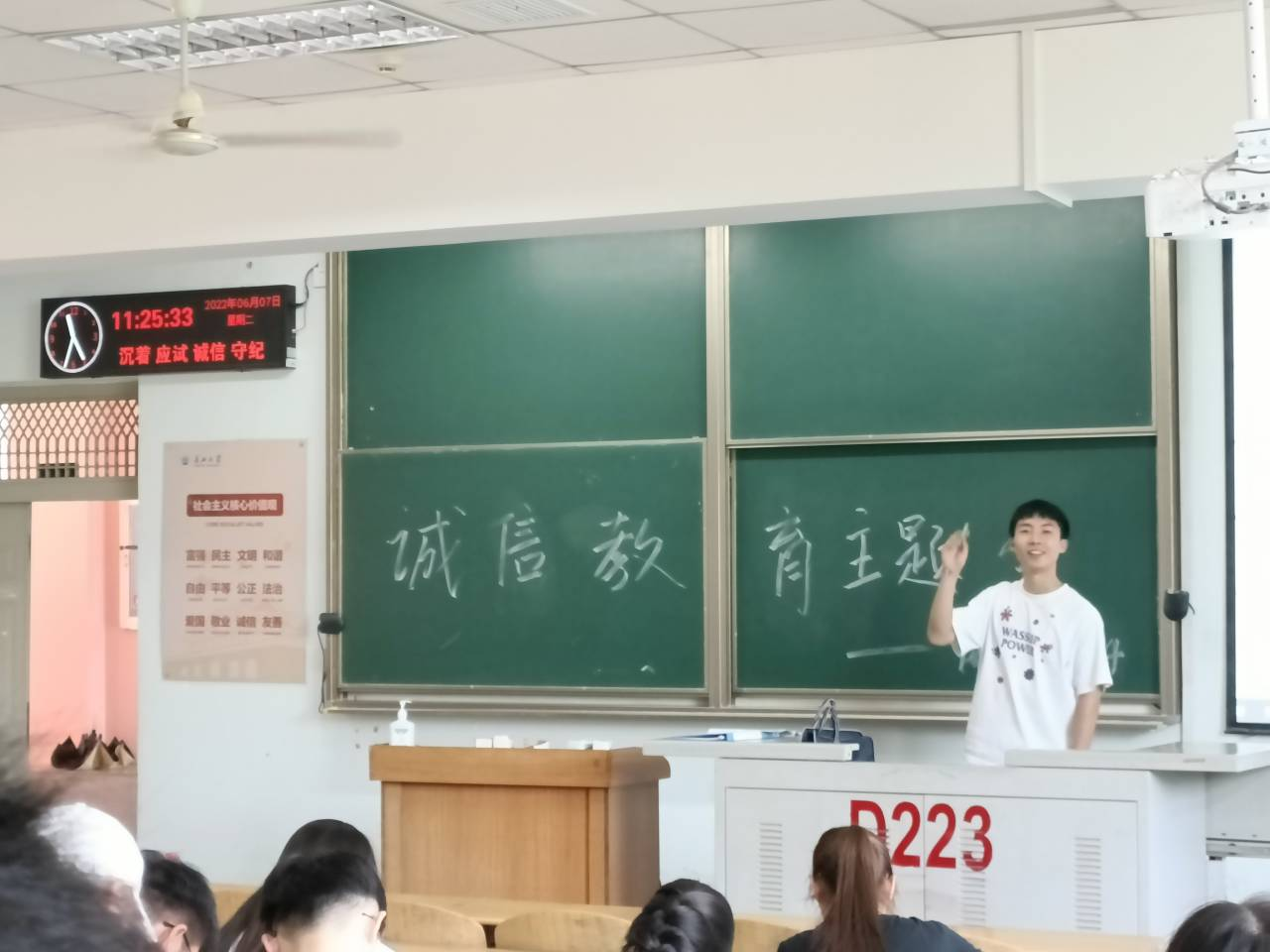 一、二年级诚信教育主题班会。各班级主题班会活动形式多样,通过观看以诚信为主题的微电影、朗诵有关诚信的经典名言、学习先进人物事迹的诚信教育,牢固树立、践行诚实守信的社会主义核心价值观。两个年级全员签订大学生英语四、六级及期末考试诚信考试承诺书。