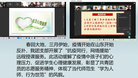在该团队的组织下,我团支部于今年三月份山东省庆云县疫情期间对山东省庆云县尚堂小学的孩子们开展了“抗疫同行,网络援助”远程授课服务。此活动缓解了疫情中孩子们的心理压力,促进学生心理健康发展,彰显了共青团员的志愿服务精神,为抗疫做出了贡献。