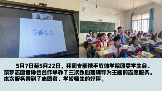 在线上授课活动取得成功后,我团支部在该团队的组织下于五月份携手教体学院团委学生会、筑梦志愿者协会合作举办了三次以心理健康辅导为主题的志愿服务活动,本次服务得到了志愿者、学校师生的好评。