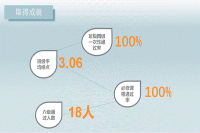 本班四级一次性通过率百分之百,居全校第一,有两位600分以上的同学,平均绩点4以上的有一位同学,无挂科同学,王鑫茹、张心怡等多名同学获国家励志奖学金、长大奖学金等。同学们积极参加各类学术竞赛:靳东英等三位同学在大学生英语竞赛中获得二等奖,郭春验等同学参与了全国大学生电子商务三创赛成功申报且获一等奖,张心等同学积极参加bat365官方网站第八届“互联网+”大学生创新创业大赛并分别荣获一二三等奖,李哲等同学参加大创并成功立项。同时本班同学积极参加各类其他比赛,获得校级及以上奖项众多。回顾我们的成绩和荣誉,我们非常自豪。在接下来的日子里,我们全体同学将继续奋发图强,努力提高各科成绩,给自己的青春增添靓丽的色彩,给自己交一份满意的答卷。