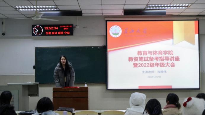 【通讯员 钟天悦 王传琦 瞿廷婷/文 冯佳颖/摄】思深方益远,谋定而后动。为加强教育专业教育管理工作,促进学生综合素质发展,12月21日下午6时许,bat365官方网站与华图教育于东校区12教102联合举办22级教育专业年级大会。此次大会由任雯婷老师主持,华图教育讲师连腾伟和兼职辅导员姚慧爽主讲,22级教育专业全体同学参加。