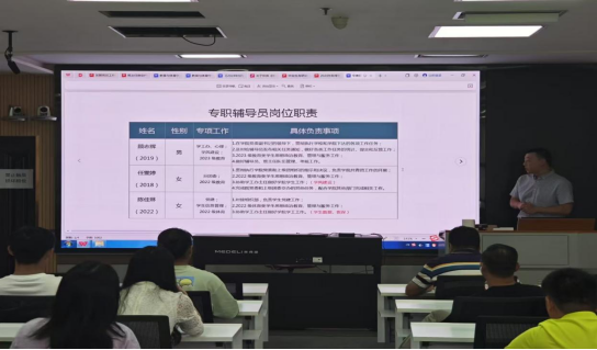 随后,学院各专干进行了工作的梳理与通报,并就党建、就业、考研、资助、优秀班集体的评选以及班主任考核方案的相关问题进行了解答和说明。