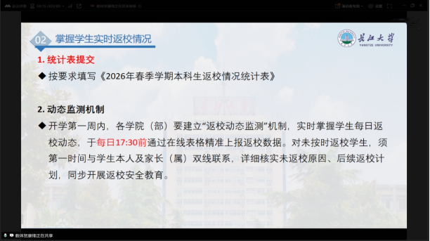 【通讯员曾雪晨】为严格落实学校2026年春季学期开学工作要求,切实筑牢校园安全防线,保障新学期开学各项工作平稳有序推进,bat365官方网站先后召开春季开学班主任和辅导员工作专题会议,并以年级或班级为单位线上全覆盖开展返校安全教育班会,全方位做好学生返校保障与安全教育工作。