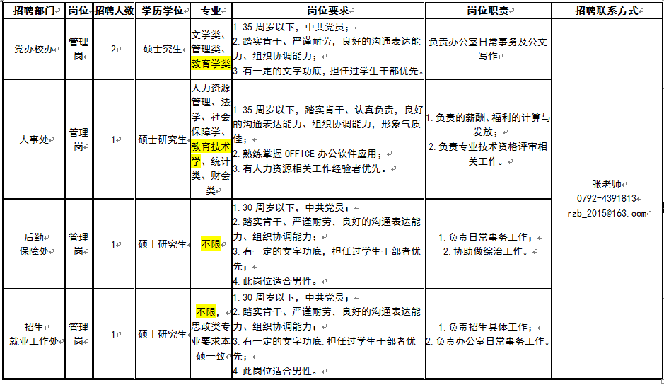 (1)邮件主题请注明应聘部门、岗位、姓名、所学专业及学历学位,例如:应聘+党政部+管理岗+姓名+专业+学历学位,应聘+管理系+教师岗一+姓名+专业+学历学位。