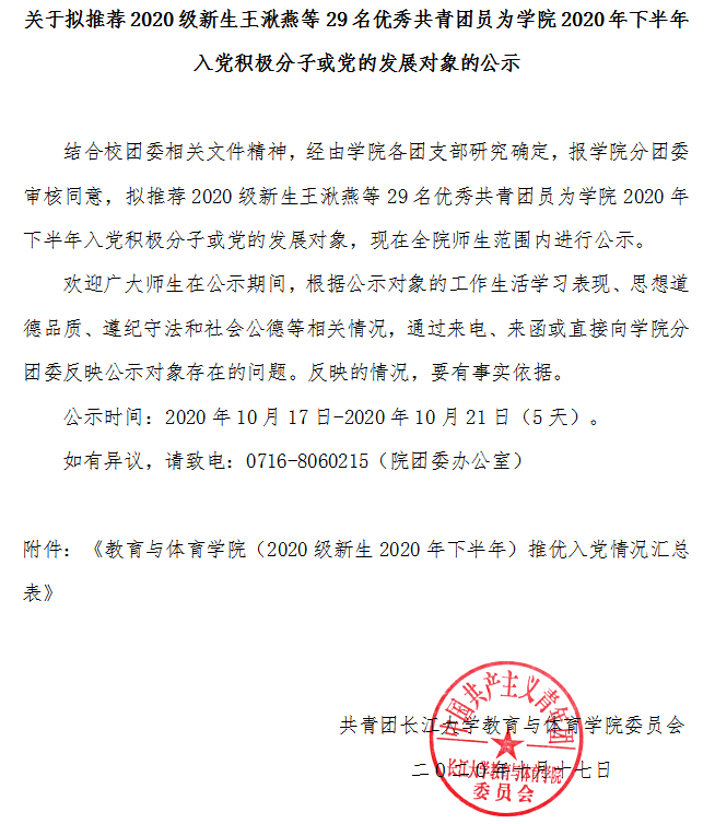 关于拟推荐2020级新生王湫燕等29名优秀共青团员为学院2020年下半年入党积极分子或党的发展对象的公示