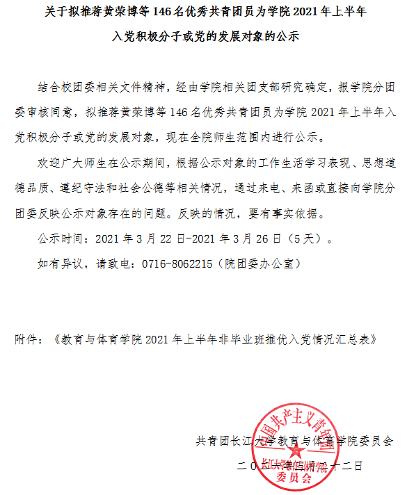 关于拟推荐黄荣博等146名优秀共青团员为学院2021年上半年入党积极分子或党的发展对象的公示