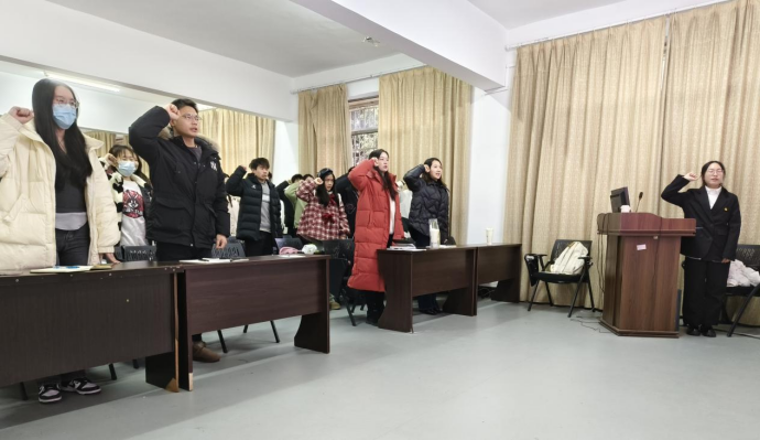 最后一项议程是重温入团誓词。在团支部副书记程璟怡领誓下,参会人员肃穆而立,高举右手,齐声庄严宣誓。