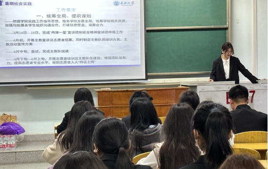 本次大会由力博志愿服务队队员周子睿主持。首先,副队长樊倩莹发表了讲话,她提出了五点工作要求:统筹全局、提前谋划;以人为本,安全为先;立足专业,创新求实;结果导向,实践育人;重视宣传,典型引领。另外,她还介绍了本学期重点工作5+N品牌创建中的“爱心义卖”和“成果展”两个预期活动。